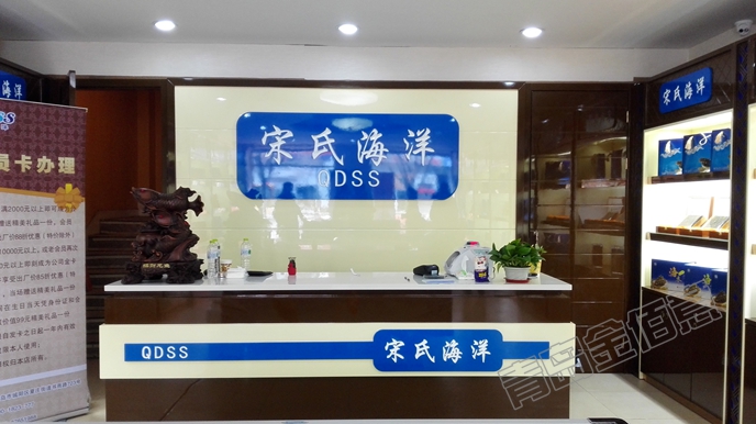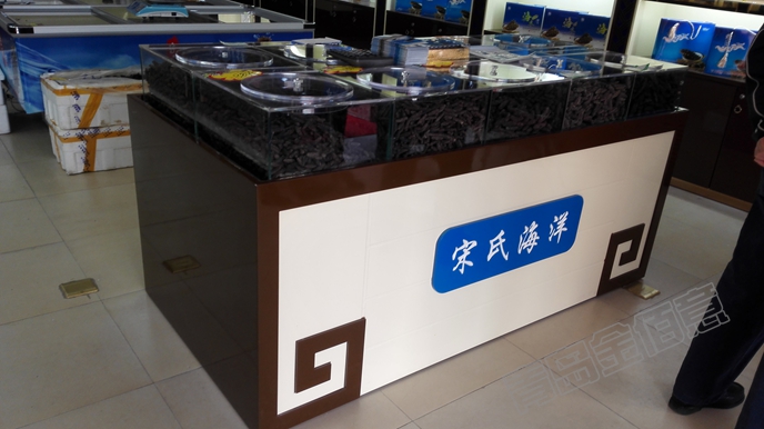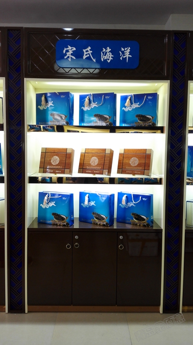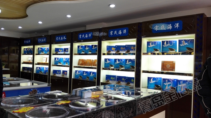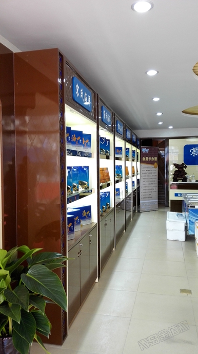 其他海參店展柜,除了名字不一樣,其他都一樣,朱紅色烤漆、鏤空花格、黃色透光石;這個海參店展柜,從造型、顏色搭配、LOGO運(yùn)用,都別具一格,效果非常好。