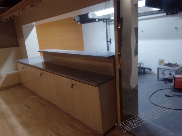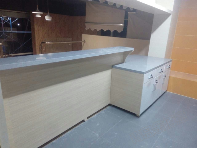 鄭莊脂渣太陽島店的大號(hào)接待臺(tái)收銀臺(tái)售賣臺(tái),集多種功能于一體,實(shí)木多層板基層,正面白橡實(shí)木皮烤漆,背面白色烤漆,臺(tái)面人造石,不銹鋼踢腳及裝飾線。做烤漆展柜,就找青島金佰意。